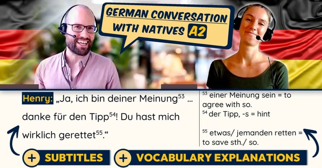 8 de October de 2023We hope you liked our German conversation A2 with native speakers on our YouTube channel! Surely you heard a lot of interesting phrases and expressions. This is why we provide you with the full transcript on this page! Now you can study all this useful vocabulary and these practical phrases in order to use them in your next conversation in German.